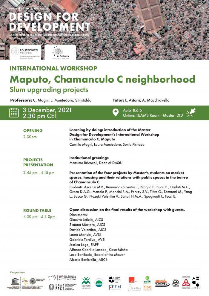 On the 3rd of December 2021 we are going to present the projects of the students of the second edition of the Master Design for Development for Chamanculo C neighborhood in Maputo, Mozambique after two weeks of workshop on site!